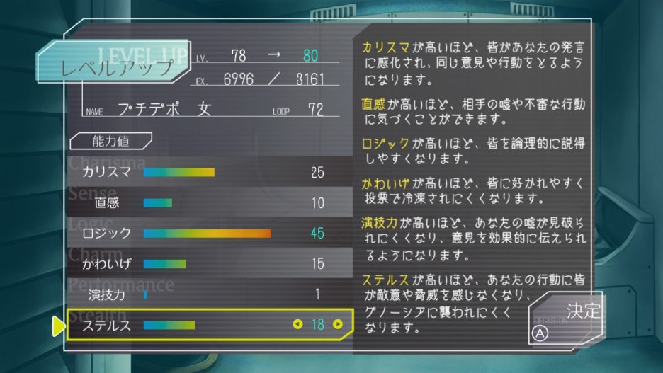 그노스라는 수수께끼의 존재에게 몇몇인간이 감염되고, 감염된 인간들은 그노시아라는 존재가 되서 사람을 지워버린다. 그런데 그 그노시아가 게임의 무대가 되는 우주선에 타게 되는 바람에 누가 그노시아인지 색출하고 콜드슬립해 위기를 넘기는 게 기본 스토리다. 하지만 이 인랑게임 스토리를 포괄하는 더 커다란 스토리가 따로 있다. 뭐냐하면 바로 주인공과 제2의 주인공인 세츠가 루프를 해 이 인량게임을 무한히 반복하면서 대체 그노시아의 정체는 무엇인가, 사라진 인간은 어디로 가는가, 대체 우리들은 왜 루프를 하는가에 대한 해답을 찾아가는 거다. 게임시스템도 스토리와 딱 들어맞는다. 매 루프마다 회의를 진행해 의심한다,감싼다,역할을 밝힌다,인간이라고 선언한다,변호한다,반론한다 등의 커맨드로 누군가를 그노시아라고 몰고 콜드슬립시키면서 중간중간에 정보를 수집한다. 그리고 이렇게 쌓인 정보를 토대로 루프가 진행되면 진행될수록 세츠와 함께 루프의 비밀을 파헤쳐 스토리가 진전된다.